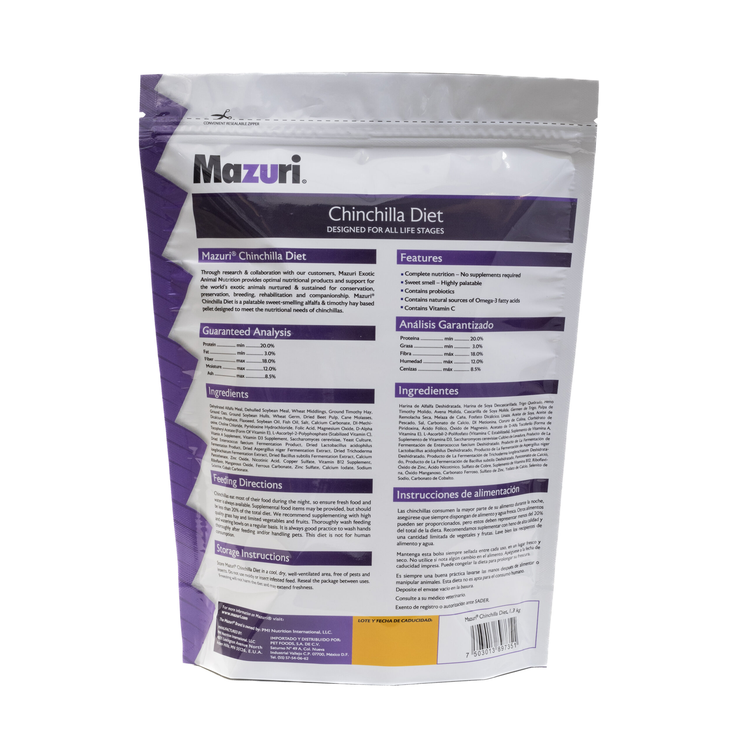 Mazuri alimento para chinchillas, elaborado para la alimentación de chinchillas en todas sus etapas de vida.